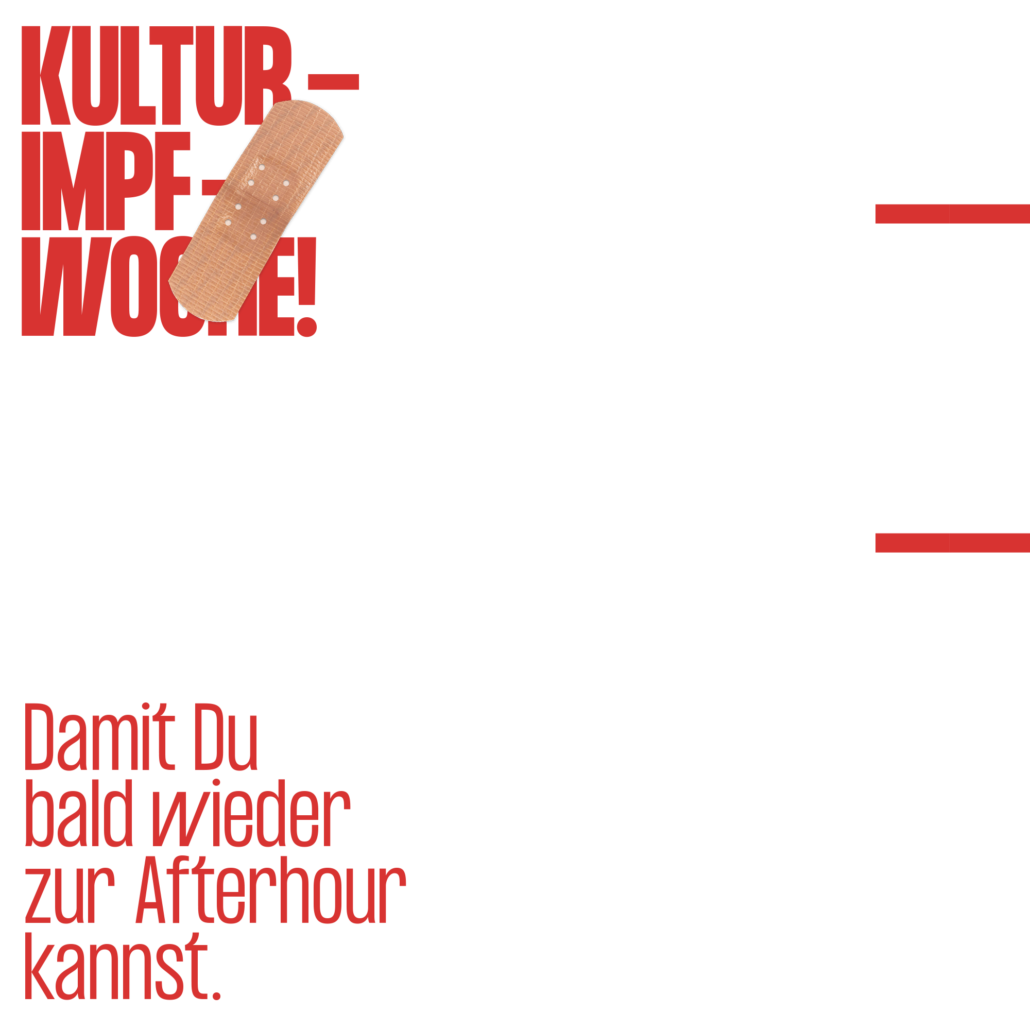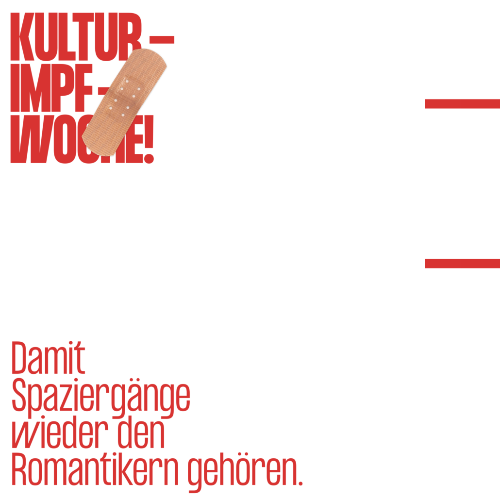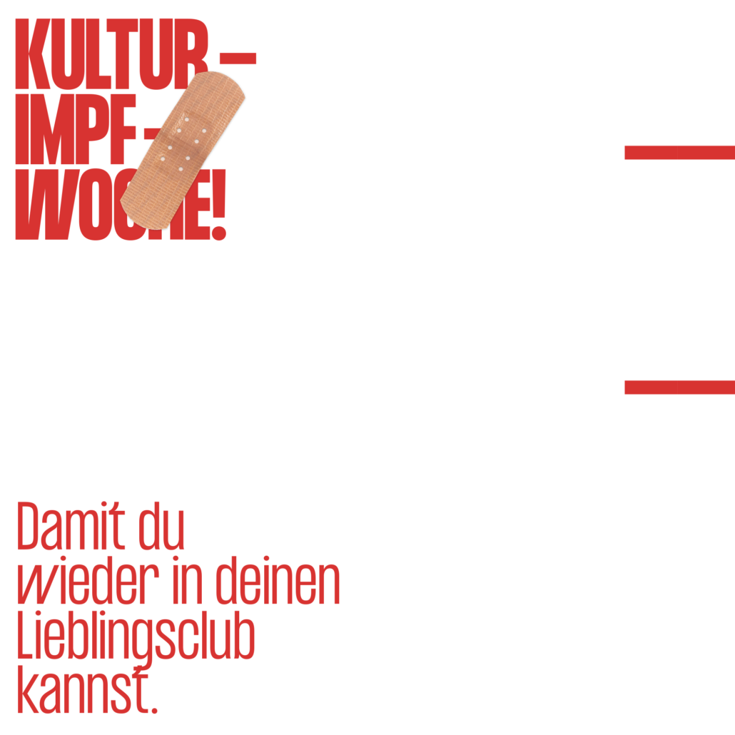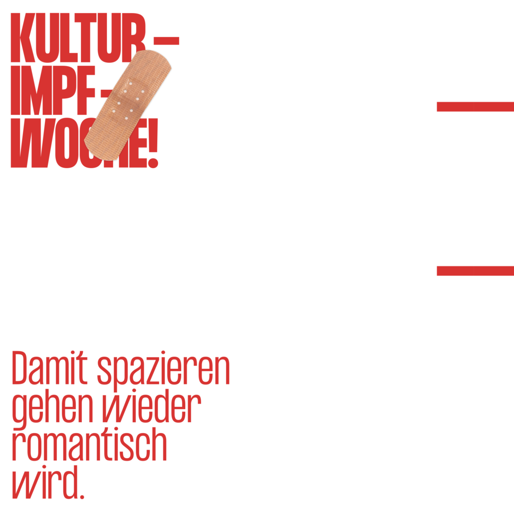 Lasst euch impfen – Damit es weitergeht! Damit ihr euren Lieblingsclub wieder besuchen könnt! Damit die Stille auf den Bühnen verschwindet! Damit ihr eure Lieblinskünster:innen endlich live sehen könnt! Damit Spazierengehen wieder romantisch wird! Es gibt viele gute Gründe, sich impfen zu lassen. Damit das kulturelle Leben der Stadt endlich wieder aufblüht, ist unserer.