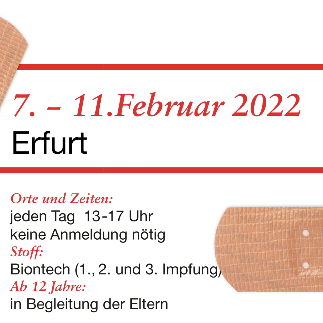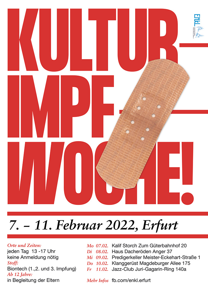 Das Erfurter Netzwerk für kulturelles Leben e.V. hat in Zusammenarbeit mit der Kassenärztlichen Vereinigung Thüringen die Kulturelle Impfwoche ins Leben gerufen. Denn die Impfung gegen Covid-19 ist entscheidend für die Verhütung und Ausbreitung dieser Krankheit und den Schutz von Menschenleben.